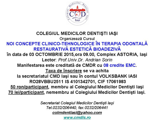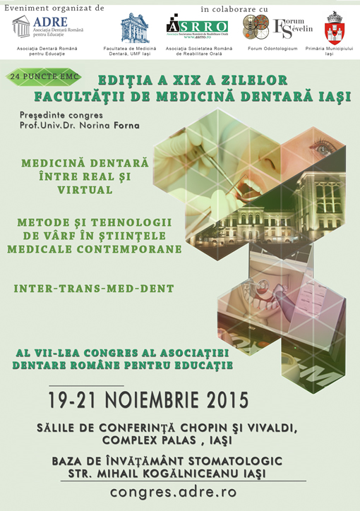 Avem onoarea de a va invita sa participati la lucrarile celei de a XX-a editii a Conferintei Nationale cu tema "Prevenirea afectiunilor stomatologice" , manifestare dedicata Zilei Organizatiei Mondiale a Sanatatii, care va avea loc la Iasi, in zilele de 10-11 aprilie 2014. Manifestarea este creditata de Colegiul Medicilor Dentisti din Romania cu 50 credite.