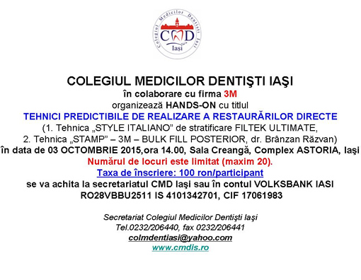 Societatea Română de Reabilitare Oro-Maxilo-Facială, Facultatea de Medicină Dentară, Universitatea de Medicină şi Farmacie ”Grigore T. Popa” Iaşi în colaborare cu Colegiul Medicilor Dentişti Iaşi vă invită să participaţi în mod gratuit la Workshopul intitulat ”Scenarii practice realizate pe manechine performante privind urgenţele medicale”, realizat în premieră naţională pentru practicienii din teritoriul medicinei dentare, aceste cursuri având un profund impact în creşterea eficienţei activităţii practice curente.